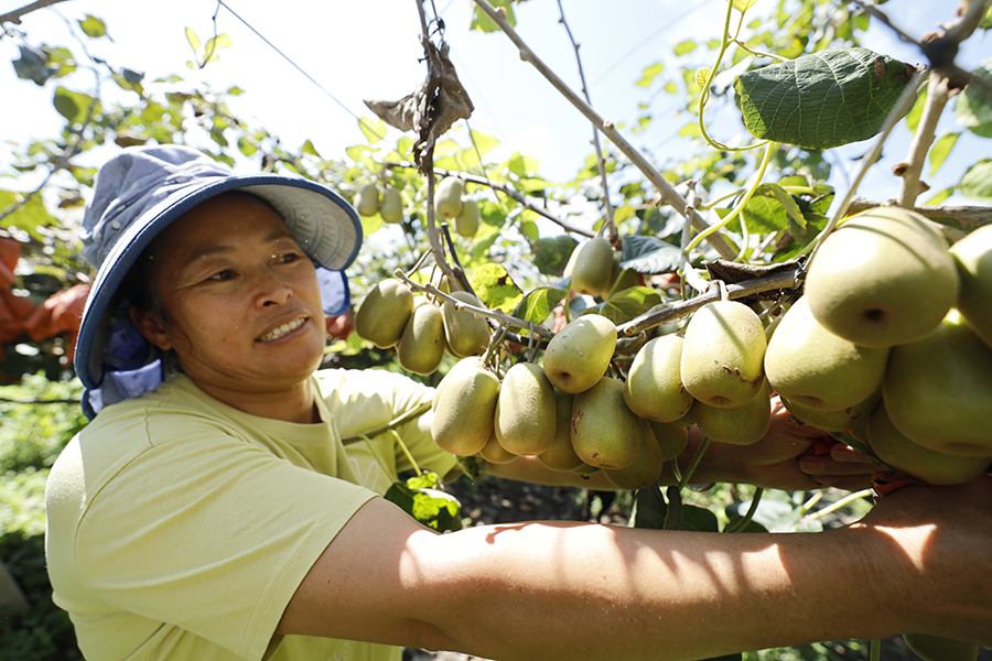 游客正在猕猴桃果园中体验采摘。