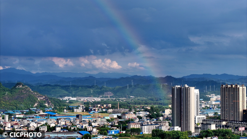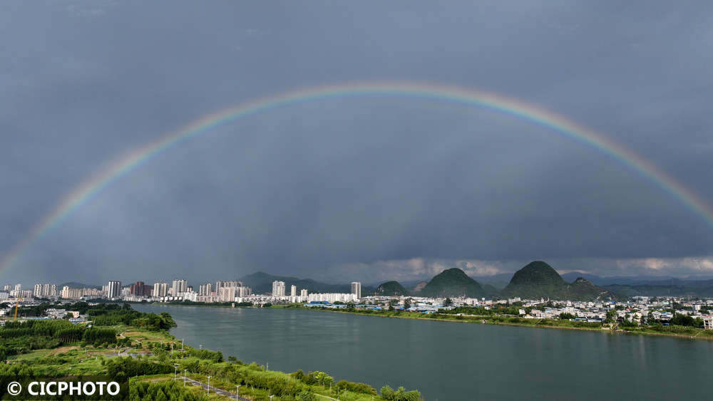 2025年9月11日午后,一场阵雨突袭广西柳州市融安县,给燥热的大地带来了一丝清凉。阵雨过后,融安县城的天空中架起了一道色彩鲜艳、边界清晰的绚丽彩虹,为桂北秋日增添一道靓丽的风景。