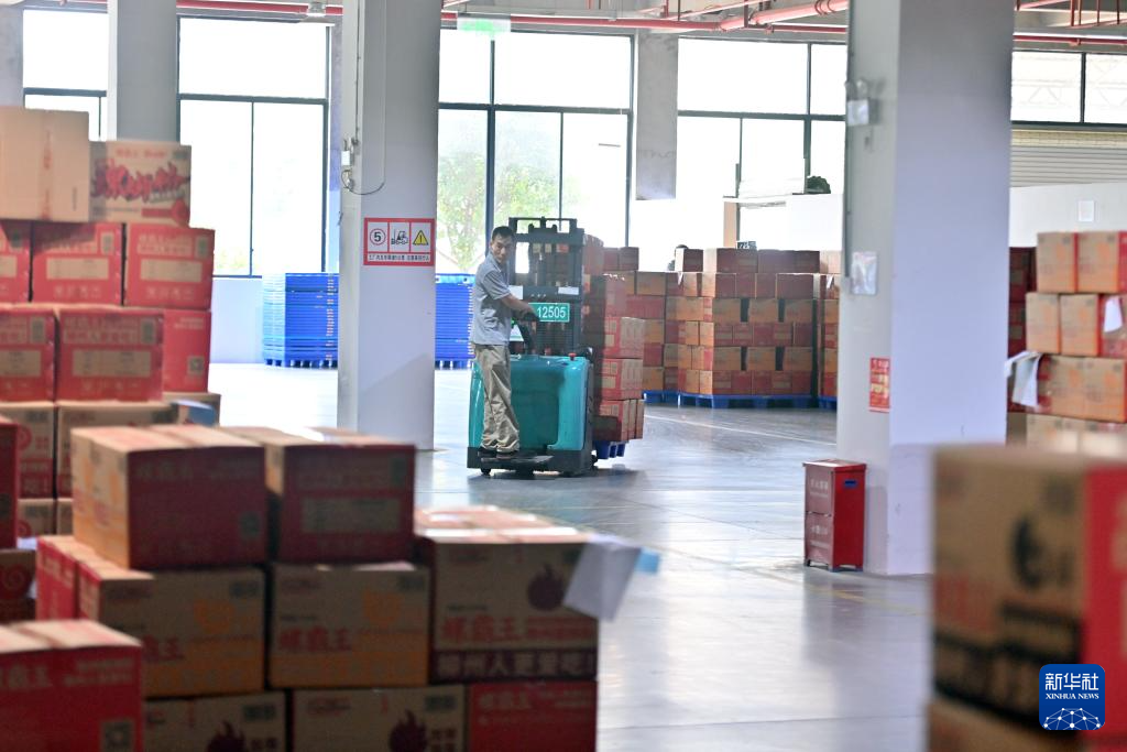 在广西螺霸王食品科技有限公司螺蛳粉仓库,工人在搬运螺蛳粉产品(9月9日摄)。