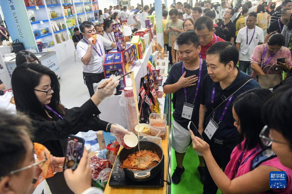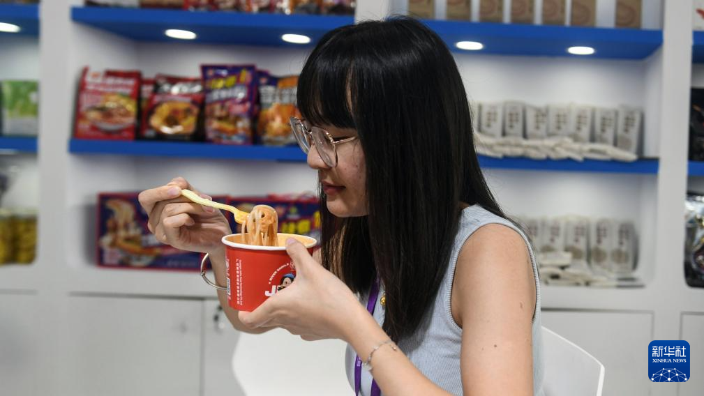 在南宁国际会展中心一家螺蛳粉企业展位,参观者准备品尝柳州螺蛳粉(9月17日摄)。