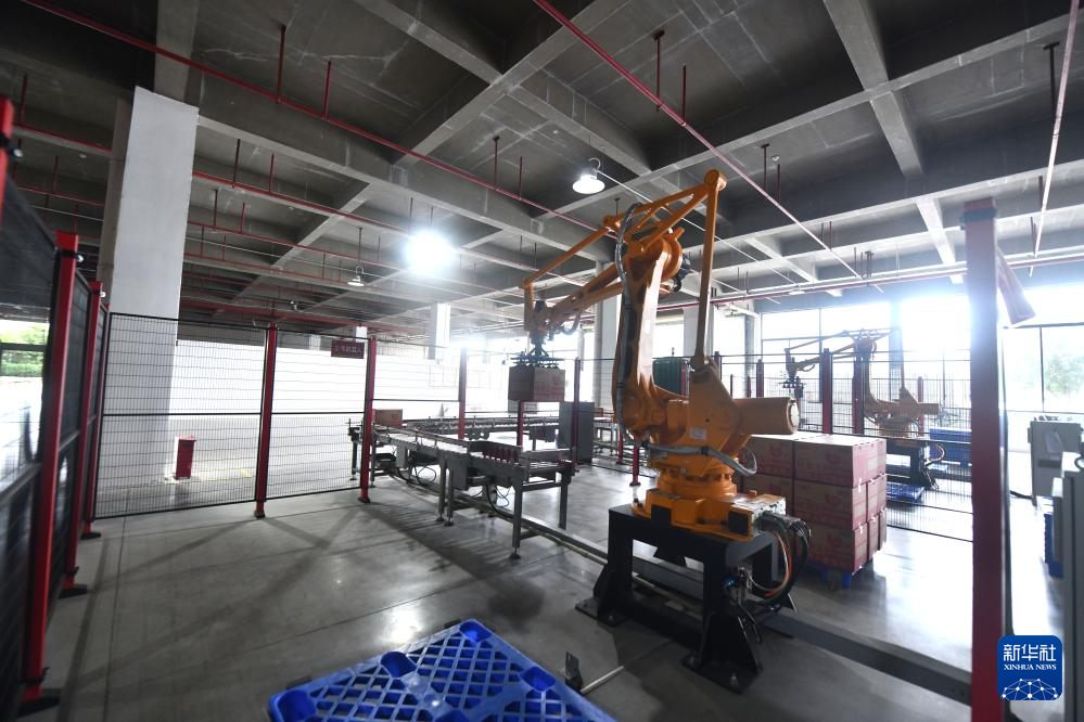 在广西螺霸王食品科技有限公司螺蛳粉仓库,机器人在打包螺蛳粉产品(9月9日摄)。