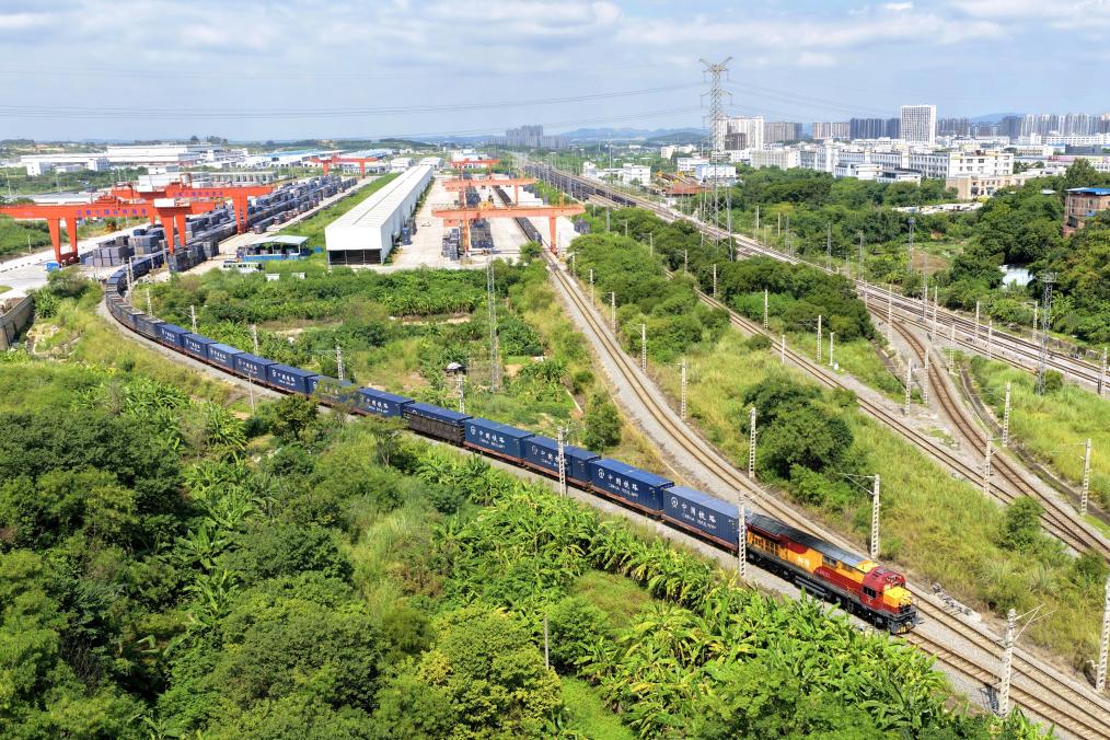 9月23日,一辆中越班列驶出南宁国际铁路港(无人机照片)。