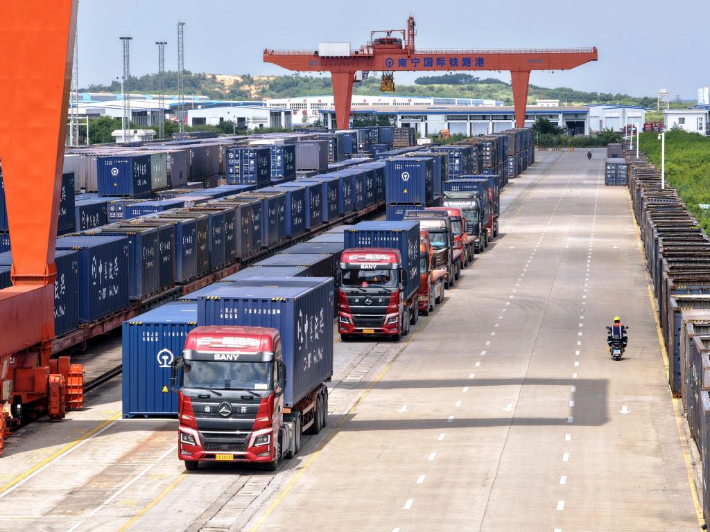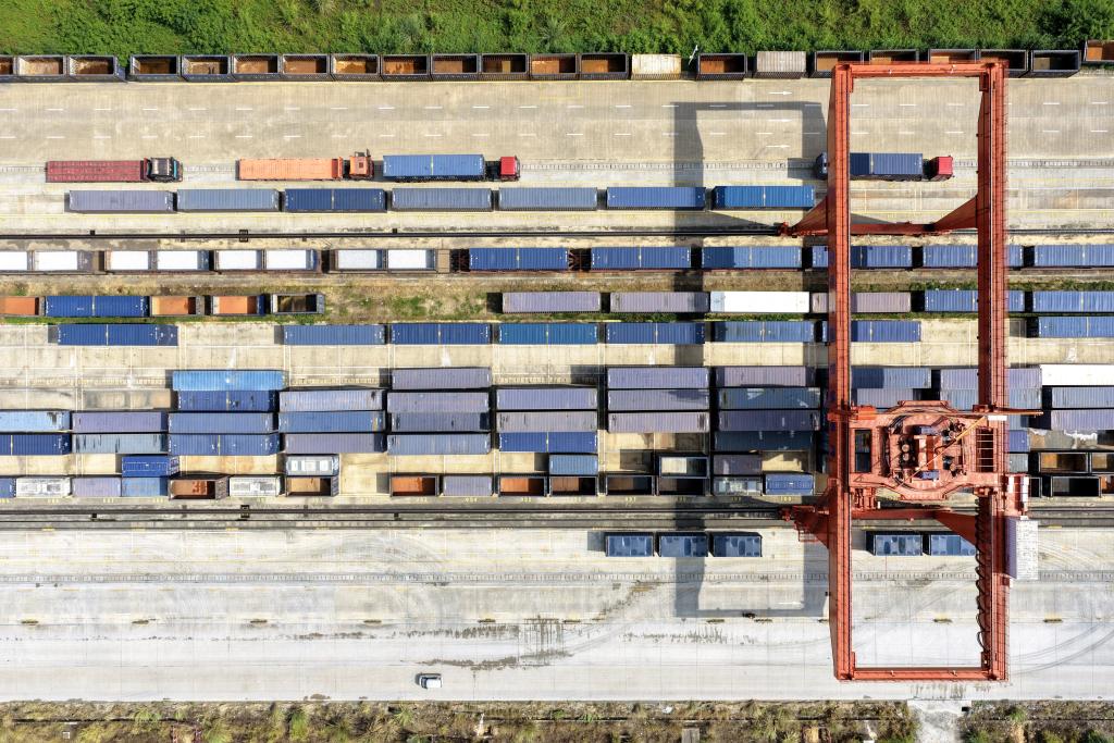 9月23日,工人在南宁国际铁路港装运货物(无人机照片)。