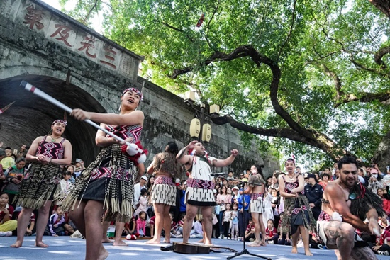 桂林艺术节期间,10位新西兰毛利人演员走进广西桂林市靖江王城,展示长矛、棍棒和甩球等传统文化