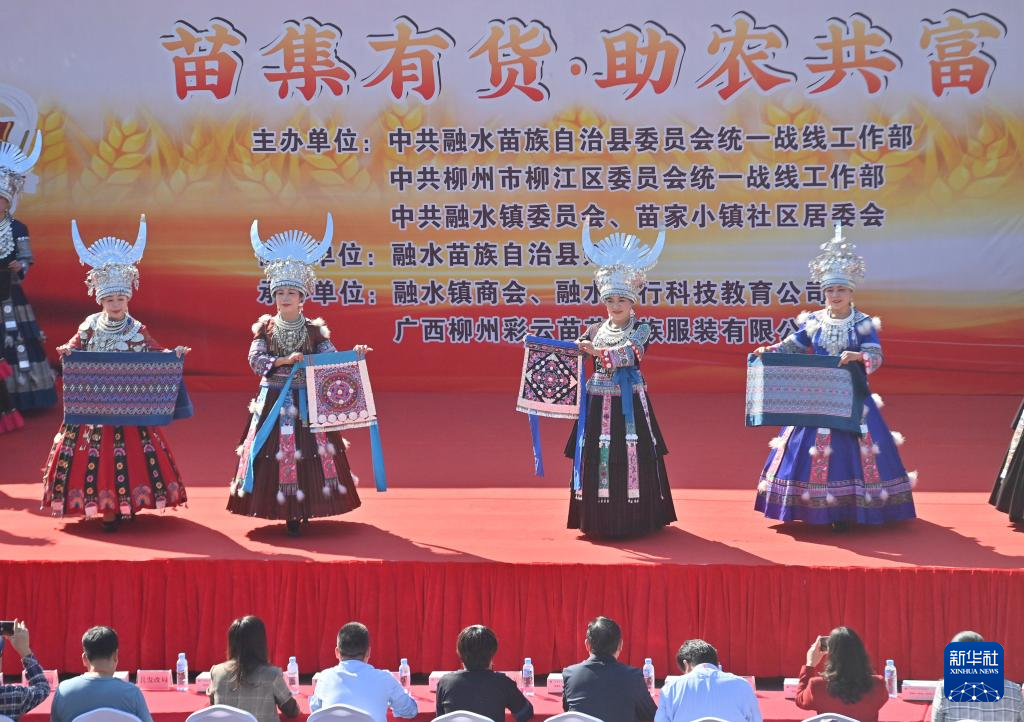 当日,广西融水苗族自治县融水镇苗家小镇社区举办第二届“苗集有货·助农共富”助农大集市,集市设立特色农产品区、手工艺品区、民族特色美食区、非遗技艺展示区等,对各乡镇的农特产品和非遗文化进行展示、展销,促进乡村振兴产业发展。
