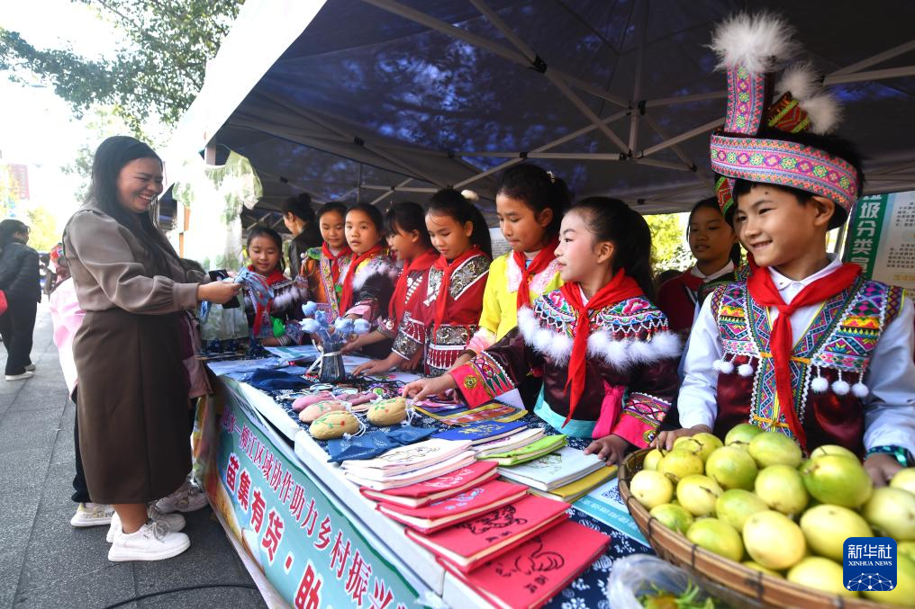 11月15日,在融水县融水镇苗家小镇社区,小学生义卖农特产品和手工艺品。