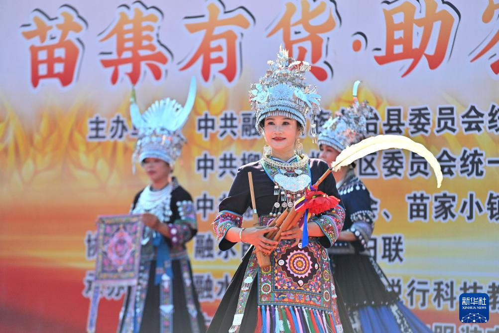 11月15日,在融水县融水镇苗家小镇社区,演员展示芦笙和苗绣。