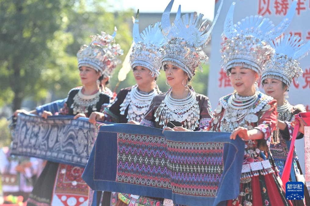 11月15日,在融水县融水镇苗家小镇社区,演员展示苗锦。