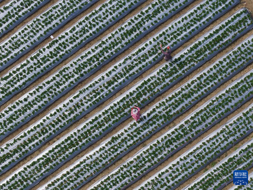 在柳州市柳江区百朋镇百朋村,村民在管护草莓(11月23日摄,无人机照片)。