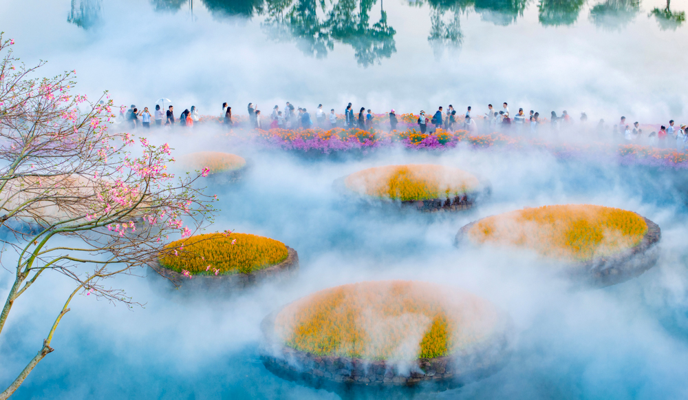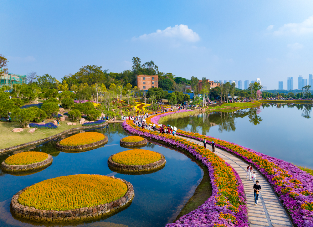近期,广西南宁市青秀山风景区丘石花园的菊花进入盛花期,绚烂多彩的花海吸引众多游客前来赏花游玩。